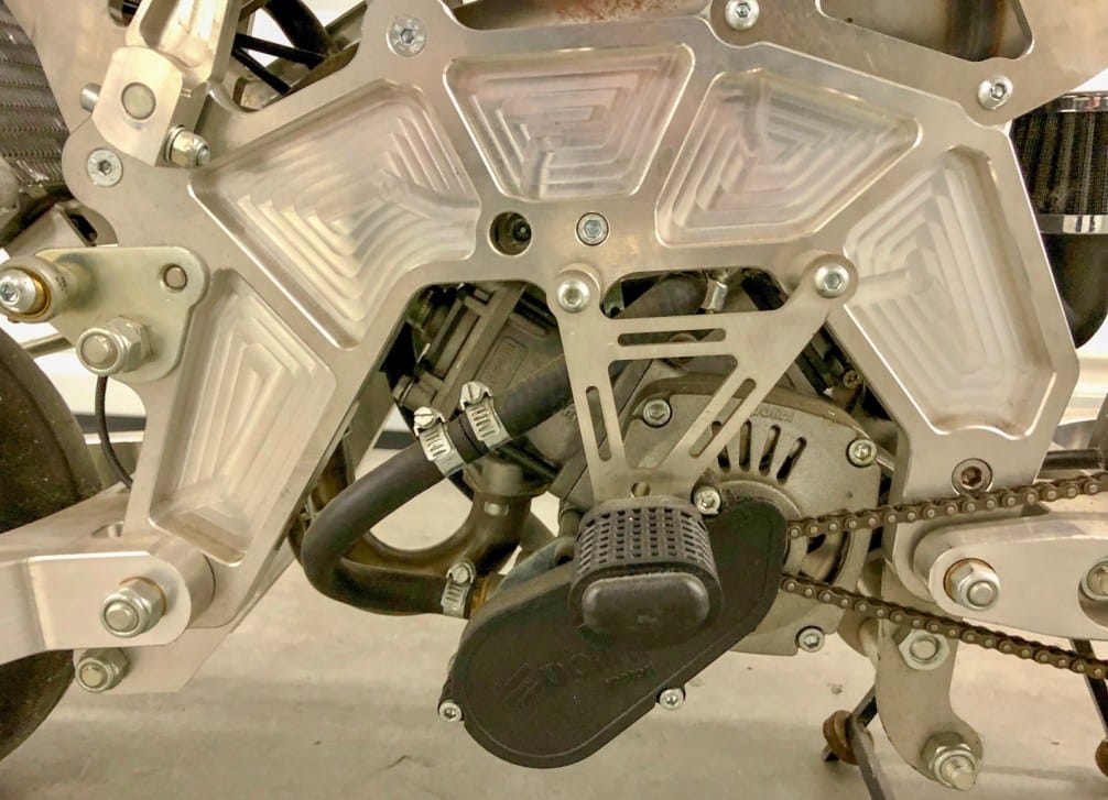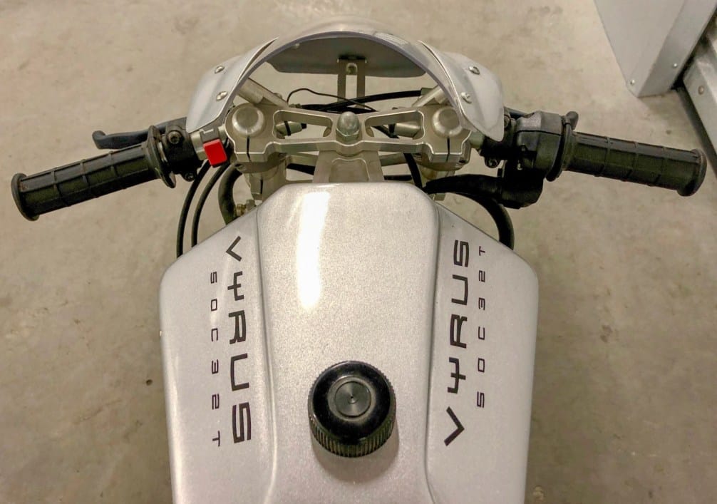 Een grotere verrassing is dat Vyrus ook een pocketversie maakte. Geen knock-off door een fabrikant van pocketbikes, maar door het Italiaanse merk zelf geproduceerd. Het gaat om 50cc tweetakt model met de klinkende naam Vyrus 50C32T. Dit kleine monster braakt 13pk uit, wat vanuit pk-motorinhoud bekeken een equivalent is van 260!