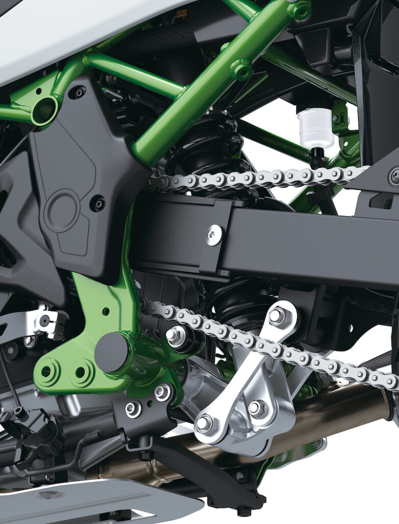 Het lichte stalen vakwerkframe is geoptimaliseerd voor stijfheid en stevigheid. De vering bestaat uit een cartridge type USD-voorvork van KYB met 210mm veerweg en New Uni-Trak achtervering met 200mm veerweg. Door traploos instelbare veervoorspanning kan de vering perfect afgesteld worden op het gewicht en voorkeur van de rijder. Het remsysteem is gericht op precisie: vooraan een 300 mm schijf met dubbelzuigerremklauw, achteraan een 230 mm schijf – beide met verfijnde doseerbaarheid. ABS is volledig uit te schakelen via een schakelaar op het stuur.