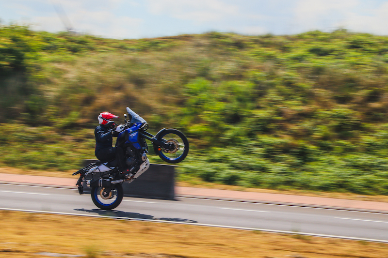 De Lommelse Sahara wel te verstaan, met daaraan gekoppeld een leuke gemixte route in de altijd gezellige Kempen. Hier en daar wat grind, hobbelige betonbanen, zandpaadjes en tot slot zelfs diep zand zijn het speelterrein waar de drie allroads hun reputatie mogen bevestigen en het duurt niet lang vooraleer de Ténéré uitblinkt. Zodra de elektronische hulpmiddeltjes uit mogen, is het de Yamaha die zijn reputatie als avonturier bevestigd met het meest voorspelbare stuurkarakter, uitstekende vering en uiteraard ook het CP2 motorkarakter. Hoewel de motor zeker niet de krachtigste is, heb je altijd trekkracht wanneer je het wilt en die souplesse en intuïtiviteit kennen we ondertussen al vele jaren, maar blijft ook in 2025 heel actueel.