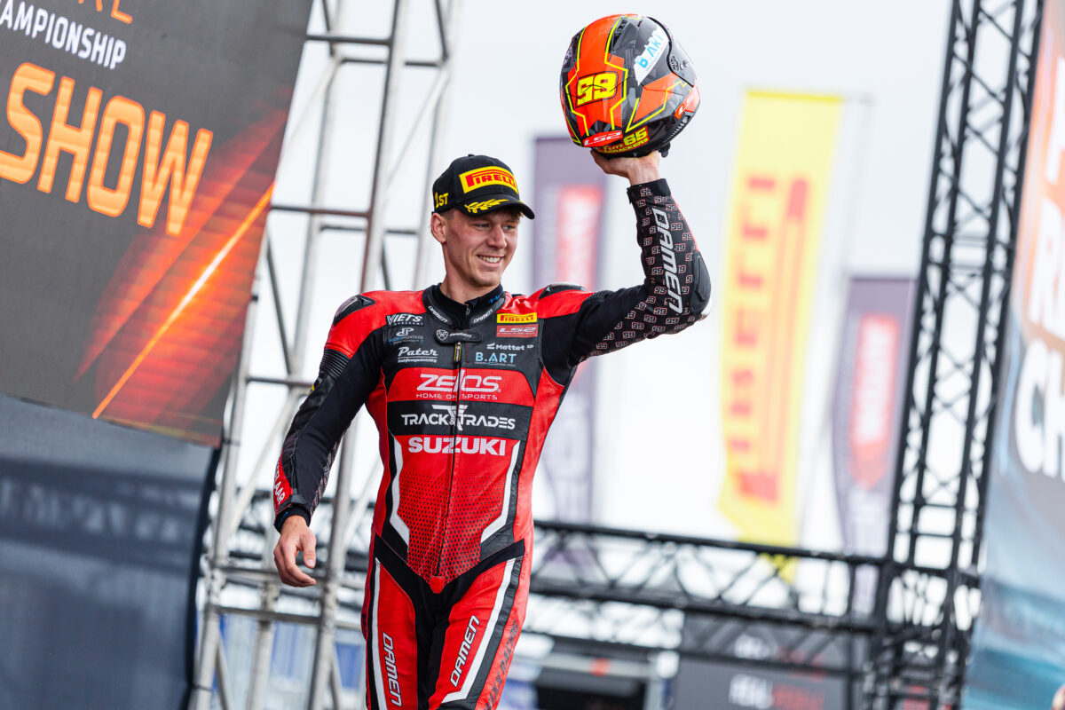 Ferre Fleerackers blinkt al enkele jaren uit op Belgisch niveau en dankzij een erg succesvolle deelname in de BSB sportsbikes klasse afgelopen jaar, lagen de verwachtingen hoog. Toch blijft het indrukwekkend om te zien hoe hij vlotjes mee kan met de wereldtop en in de tweede manche op Assen zelfs met de overwinning aan de haal ging op zijn Wixx Trading Suzuki GSX-8R. Eentje om de rest van het seizoen in de gaten te houden dus.