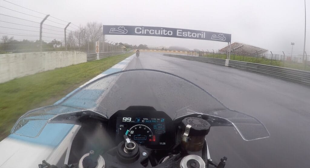 Want o jawel, nog voor we konden starten, lag Estoril al kleddernat en dus werden er regenbanden gemonteerd. De elektronische rijhulpjes moesten de facto op ei-in-de-broek-modus en een gloednieuwe toplaag van het circuit zorgde voor nog wat extra glibberigheid. Gelukkig was Bridgestone goed vertegenwoordigd op het evenement en na een kleine bandentemperatuur-controle bleek dat we probleemloos gas mochten geven. Iedere ervaren motard weet dat ‘regen gewoon in je hoofd zit’ dus viel ik de tweede sessie aan met volle vertrouwen (en iets meer focus op de motor).