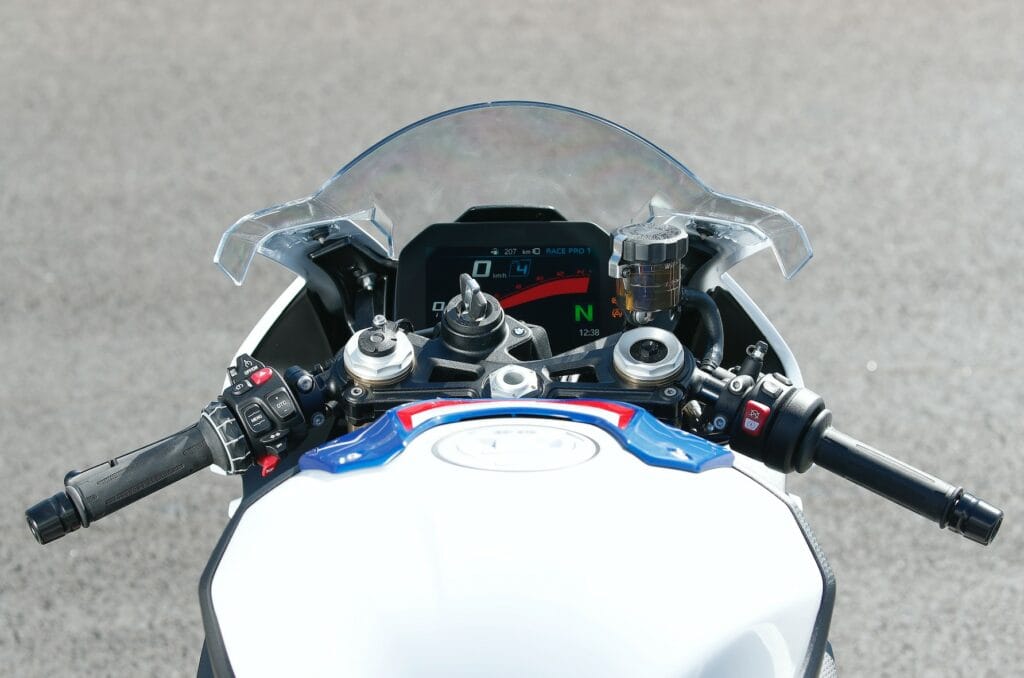 Liever een hondsdolle Duitse scheper die in je reet bijt zodra je verkeerd naar z’n gashendel kijkt? No problem. En alles tussen die twee extremen in is ook vlot te regelen via de intuïtieve BMW stuurknoppen die we al enkele jaren kennen. Toch is er nog een belangrijke toevoeging: een + en – knopje op de linkerclip-on om on the fly je tractiecontrole te regelen – voortaan waant iedereen zich dus Casey Stoner.
