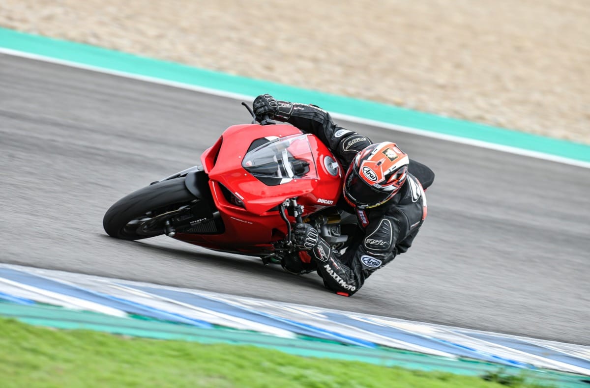 De motoren staan voor deze test op volwaardig racerubber: Pirelli Super Corsa SC1 vooraan en een SC2 achter. De bandenwarmers gaan eraf en we mogen één voor één de baan op. Ik ben zowaar lichtjes zenuwachtig op dit nieuwe circuit, omringd door een erg professionele Ducati crew, maar de kleine Panigale stelt me meteen gerust. Hij blijkt de ideale metgezel die met een minimum van input op hellingshoek gaat. Het stuurkarakter is ontzettend licht en zelfs met mijn lange figuur klopt de zithouding perfect. Het zadel werd 2 cm langer waardoor grotere rijders (zoals ik) net dat tikkeltje extra plaats hebben en ook de druk op m’n polsen valt beter mee dan verwacht. Ondanks een halve centimeter extra polstering, blijft het nieuwe zitje wel redelijk hard, maar uiteraard comfortabel genoeg om circuitsessies af te werken.