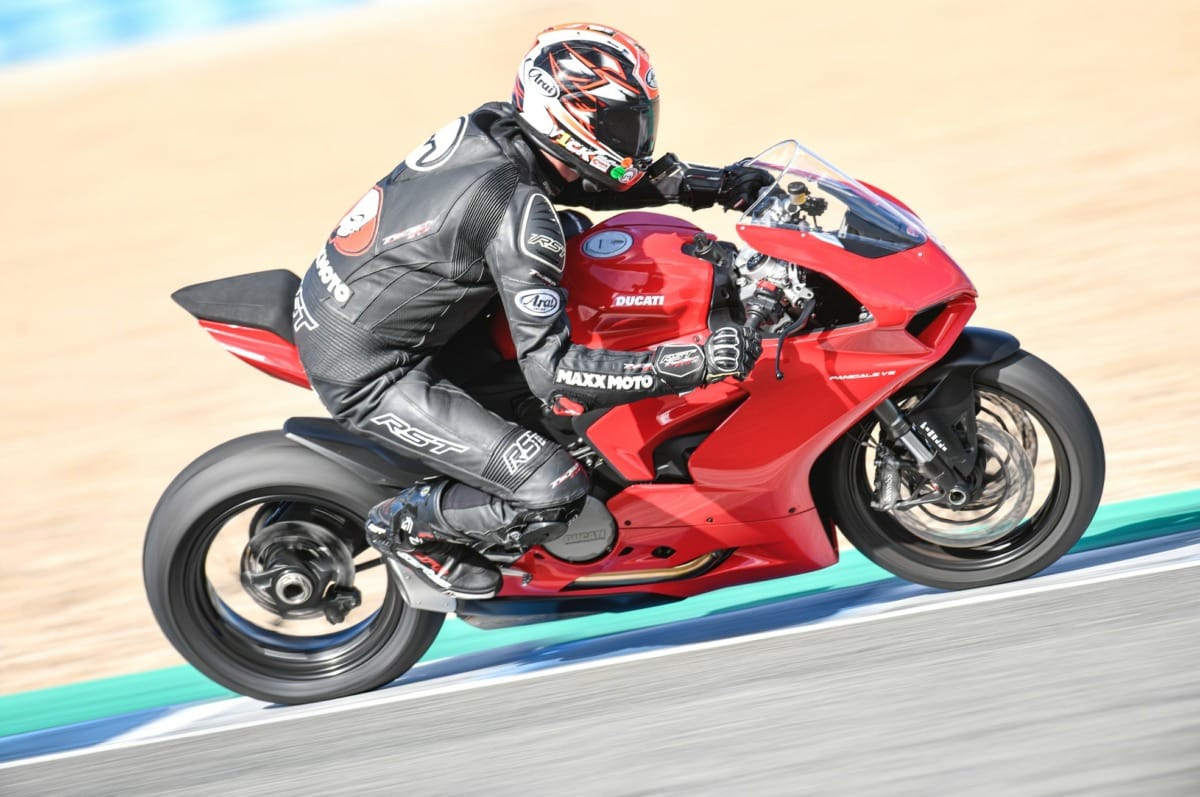 Ik lig plat op de tank van een Panigale V2 op het circuit van Jerez. Er zijn slechtere plekken om je dag door te brengen, al loopt het hier niet van een leien dakje. De laatste sectie van Jerez is heel technisch en ingewikkeld, maar gelukkig kreeg ik advies mee van Ducati testrijder Alessandro Valia. Een versnelling hoger, wat minder toeren maken en… focussen op een hoge bochtensnelheid. De adrenaline giert door mijn lijf en ik voel me joliger dan een puistige puber in de Game Mania. Man, wat is dit dikke fun!