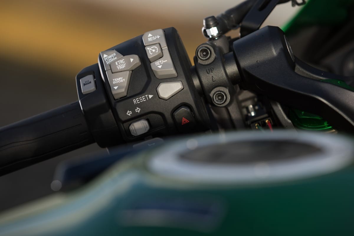Want zodra ik oog in oog kom te staan met de H2SX, is het LCD-display het eerste wat me opvalt als iets volledig nieuw voor Kawa. Zowel op de linker- en rechterstuurhelft vind ik veel knopjes terug en ik mag wel stellen dat de elektronica pakket erg uitgebreid is – zoals op de meeste hedendaagse toerfietsen. Deze motor is niet eens uitgerust met elektronische vering, maar de combinatie van verschillende dashboardlayouts, instelbare rijmodi (Low, Medium, Full), tractiecontrole (3 -meest ingrijpend-, 2, 1, Off), uitschakelbare quickshifter, cruise-control, launch control, etc. is aanvankelijk nogal veel om te vatten.