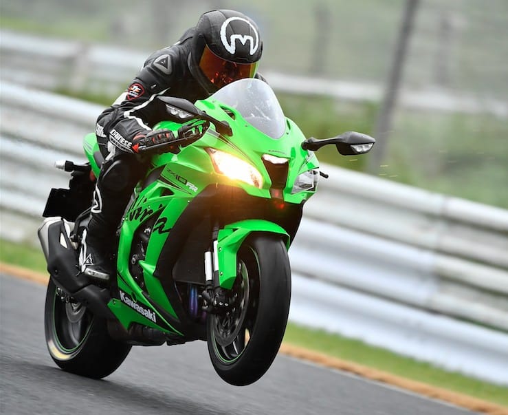 Hoe meer sessies ik draai, hoe meer ik besef dat deze ZX-10RR écht iets speciaals is. Nee, qua looks of elektronica is het niet de grote vernieuwer, al is het net dàt wat me zo aantrekt. Iedere euro Yen ging naar de ontwikkeling van een sterker, betrouwbaarder motorblok dat gemakkelijk te tunen is tot een heel eind boven de 200 achterwiel-pk’s. Met een chassis waarop iedere rijder comfortabel en met het volste vertrouwen snelle tijden kan draaien. Om nog niet te beginnen over de loepzuivere gasrespons en de elektronica die ongemerkt ingrijpt en enkel opvalt door een flitsend verklikkerlichtje. Je mag dus gerust stellen dat de ZX-10RR zowat de Japanse ‘Zen’ versie is van wat de Italianen met veel poeha en flitsende kleurstellingen verkopen als ‘Edizione Erre Esse Speziale Legerra Superformaggio’.