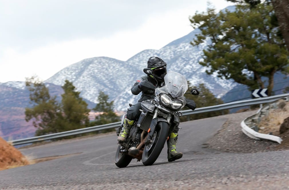 Omdat motorjournalisten standaard rotverwende egotrippers zijn, hoeven we niet te rijden met de basismodellen en krijgen we dus de XRt en XCa voorgeschoteld. Mooi zo, want tijdens de frisse ochtend biedt de zadelverwarming al meteen een meerwaarde. Ook de handvatverwarming wordt ingesteld op standje pili-pili en met een dikke thermobuff aan, trekken we het Atlasgebergte in. De eerste kilometers zijn mooi om de verschillen met de vorige generatie Tiger 800 te ontdekken, en daarbij springen enkele dingen in het oog. Zo is er uiteraard het nieuwe kleuren TFT-dashboard met daarboven een erg handig verstelbaar windscherm. Door het met één hand naar voren te duwen en naar boven/onderen te schuiven, krijg je gemakkelijk geen of veel rijwind. Een duidelijke verbetering en dat mag ook wel van de uitlaatsound gezegd worden. De nieuwe 800’s kregen een smallere demper die een stuk dieper klinkt in lage toeren en luider brult als je het gas open trekt. De ideale versterker voor die heerlijke triple sound.