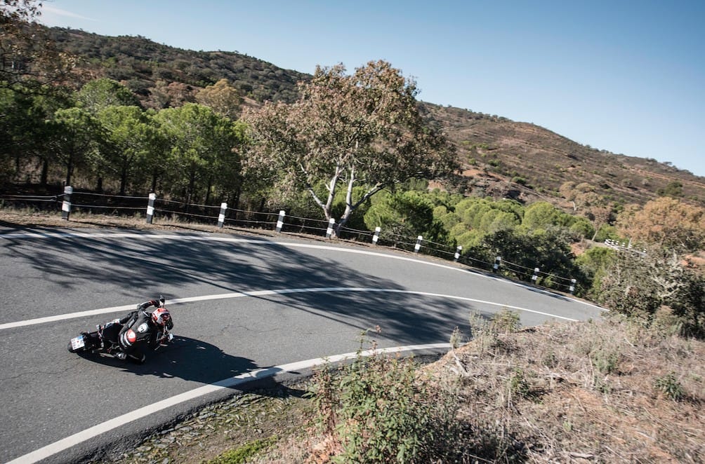 We verlaten de bebouwde kom en duiken het bochtige, Portugese hinterland in. Meteen gaat het gas er op. Het is mijn eerste rit van het nieuwe seizoen en ik moet nog even wennen, maar de handelbare MT stelt me meteen op mijn gemak. De rechtop zithouding is ruim, het zadel niet te zacht en ik heb genoeg bewegingsvrijheid voor mijn lange stelten. De positie van het stuur vind ik, net als op de standaard MT-09, iets aan de hoge kant. Het went niettemin snel en als de eerste hairpins worden aangesneden, gaat het tempo nog eens omhoog. Ik ervaar voor het eerst de voordelen van de nieuwe, sportievere vering. Het vage gevoel heeft plaats gemaakt voor een snaar strak sturende voorkant. Elke beweging van het voorwiel wordt meteen gecommuniceerd naar het brede stuur. De achterzijde reageert echter minder rigide, zowel in krap haarspeldwerk als in snelle doordraaiers gaat de boel lichtjes deinen. Niets om me zorgen over te maken, de SP houdt de gekozen lijn aan, maar toch belet het me om er vol voor te gaan.